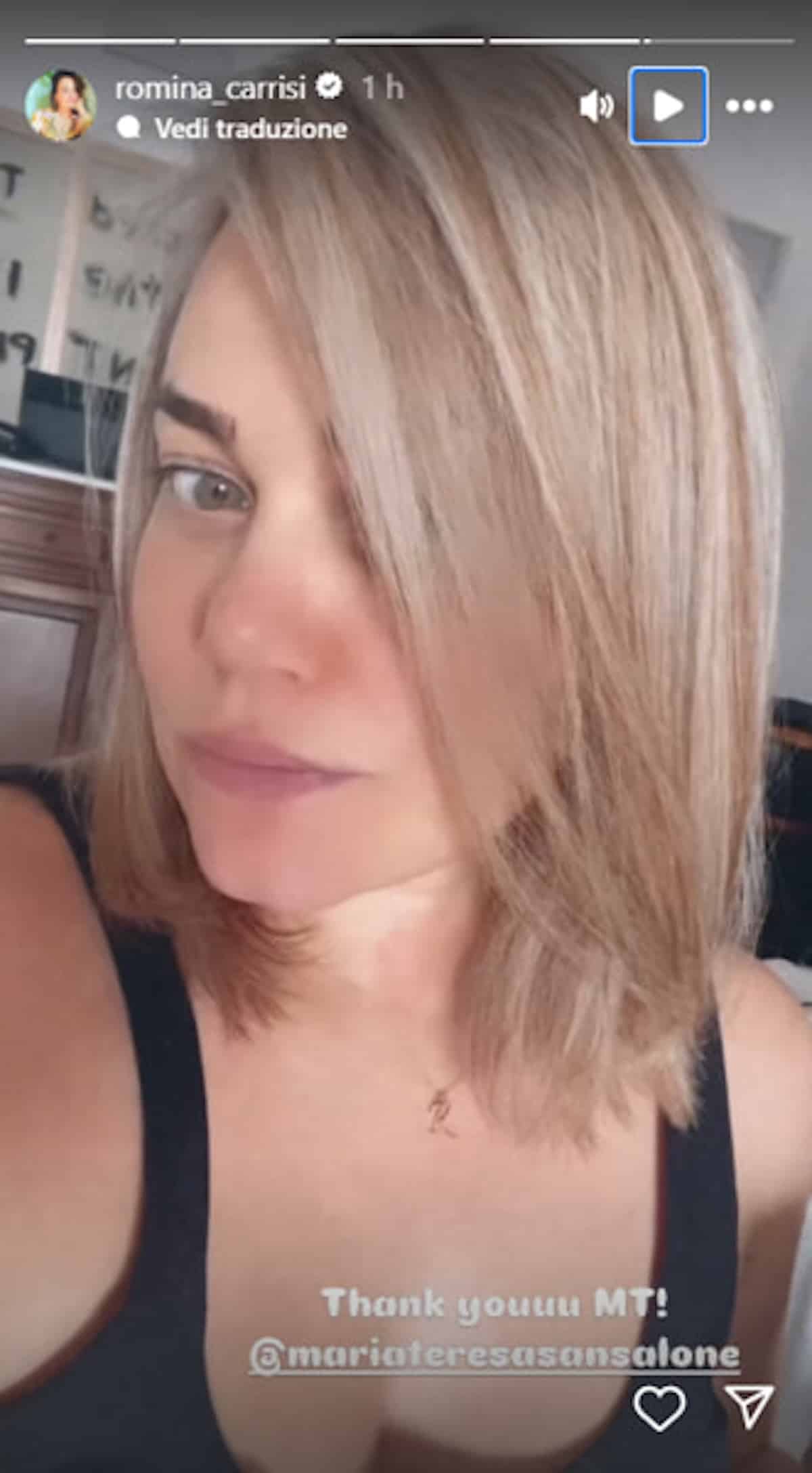Non avrà ancora ritrovato la linea ma intanto ha deciso di dare una vera svolta all’hair look. Sempre dalle Storie, ecco spuntare una Romina Carrisi completamente diversa. A circa 10 mesi dal parto è andata dal suo parrucchiere di fiducia per cambiare il taglio e il colore. Addio capelli lunghi e scuri, benvenuto caschetto con un ciuffo lungo e biondo. Una scelta inaspettata, ma sta davvero benissimo.
